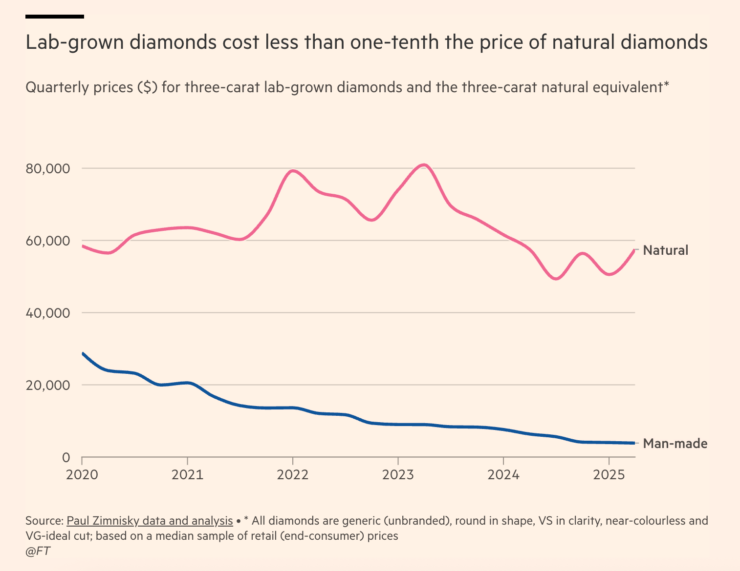 All this brings me to the lab grown diamond. Scientists created the first lab grown diamonds in 1954, but it took another 17 years for the first “gem-quality” diamonds to be made, and further iterating to perfect the product. In 2018, the FTC ruled that they were akin to diamonds. Consumers, who increasingly focused on ethics and sustainability in their purchases, were searching for an alternative to the much maligned natural diamond. Ironically, De Beers played its own role in this market shift, pushing lab grown diamonds in an effort to create a two-tiered system that highlighted the superiority of the natural product. This backfired, and while analyses of the diamond market are variable, all agree that lab grown diamonds have rapidly increased their share of the diamond market in the last five to seven years.